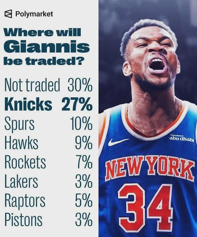 字母哥新下家赔率已经出炉,尼克斯、马刺和老鹰分列前三,火箭第四,湖人第五,猛龙第六,活塞第七。