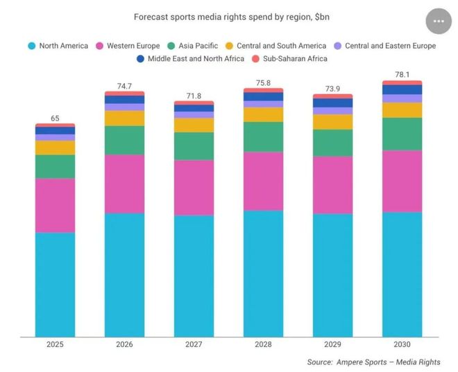 支撑这一预测的基础来自北美市场,自2025-26赛季开始,迪士尼旗下的ESPN和AT&T每年合计为NBA版权支付27亿美元,而2029年MLB也将开启新的转播周期,苹果预期将加入争夺新周期MLB的流媒体版权,涨价几乎板上钉钉。此外,普遍被认为价值低估的NFL在2026年也有望开启新周期版权谈判,达成一份更高价值的转播协议也是市场预期的结果。 Ampere在报告中预测,北美将从2025年的318亿增长至2030年的380亿美元,占据全球总预计增幅的47.7%。