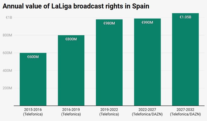 更让特瓦斯们欣喜的消息来自场外。近日,西甲联盟官宣完成2027-28至2031-32周期的西甲国内版权招标,西班牙电信(Telefónica)与 DAZN 两家平台完成续约,总价高达52.5亿欧元,对比上一周期(2022-23至2026-27周期)的49.5亿欧元上涨6%。如果算上西乙和商业场所、免费及赛事集锦三大板块,西甲联盟国内视听版权总收入更是达到61.35亿欧元,对比上一周期录得9%的增长。