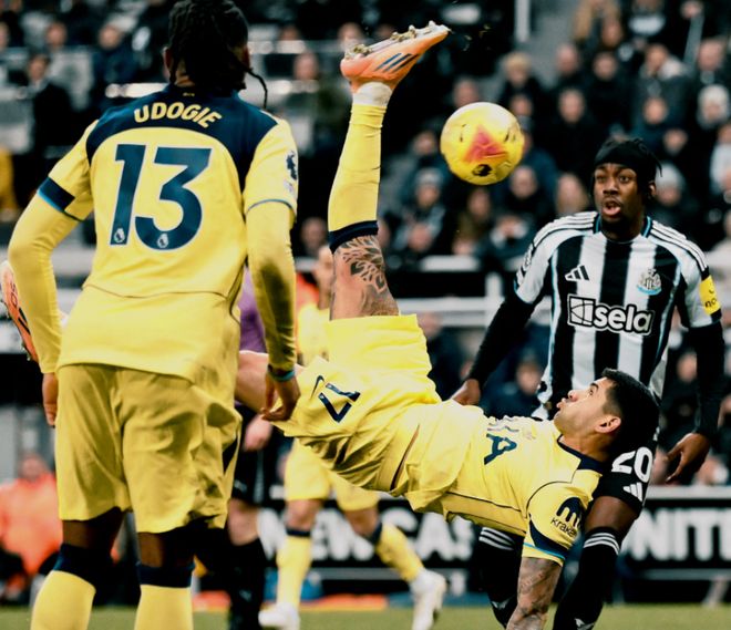 热刺与纽卡斯尔联的比赛踢出了2-2的结果。这场比赛直到第70分钟之后才上演激烈的进球大战。吉马良斯在第71分钟推射破门,帮助纽卡斯尔联取得领先。8分钟后,罗梅罗头球顶进,扳平比分。第86分钟,依靠点球机会,戈登主罚破门。补时阶段,罗梅罗犹如天神下凡,他倒钩射门打进,完成极限绝平,拯救了热刺。虽然热刺没有输球,但也没有赢球,依然深陷不胜怪圈,各项赛事连续5场都没有赢。